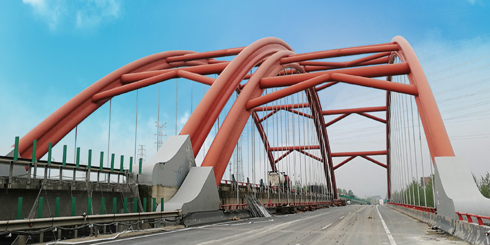 該橋位于寧杭高速公路,跨越南河航道,2003年建成通車(chē)。橋梁總長(zhǎng)659m, 其中主橋?yàn)閷?shí)土系桿拱橋,引橋?yàn)轭A(yù)應(yīng)力組合箱梁和現(xiàn)澆箱梁。橋梁為10X25m組合箱梁+130m鋼管混凝土系桿拱+4X25m組合箱梁+(2X20+18+14)m現(xiàn)澆箱梁+4X25m組合箱梁,橫向雙幅布置,單幅寬16.75m, 主橋最大跨徑為130m, 引橋共22跨。由于航道改造需要,需對(duì)全長(zhǎng)659m的南河特大橋整體頂升2.16m。頂升后北側(cè)引橋增加4跨,南側(cè)引橋增加6跨。改造總長(zhǎng)度1530m, 其中老橋頂升長(zhǎng)度659m, 新建橋跨250m,道路接坡721m。該橋比我們已完成的橫潦涇大橋整體頂升的最大跨徑還要大5m, 我司于2018年12月完成了該橋左半幅的整體頂升;于2019年6月完成了該橋右半幅的整體頂升。