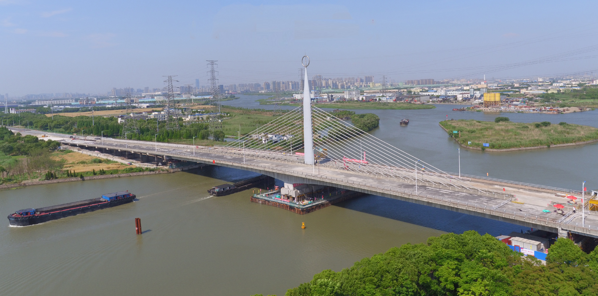 位于江蘇省昆山市江浦路吳淞江大橋是一座特大型橋梁。主橋?yàn)?01m+ 101m單幅單塔兩跨變截面斜拉橋,引橋?yàn)楹?jiǎn)支板梁,兩側(cè)各8孔,跨徑為22m,引橋總長(zhǎng)352m,橋梁總寬33m。