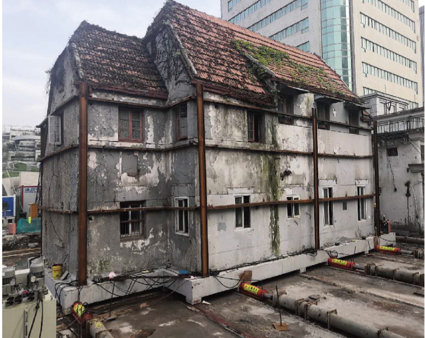 整個(gè)平移步驟分為三步:第一步,向東南方向平移6.88m;第二步,逆時(shí)針旋轉(zhuǎn)5.43°;第三步,向東北方向平移8.58m。該工程于2020年4月開工,6月竣工。