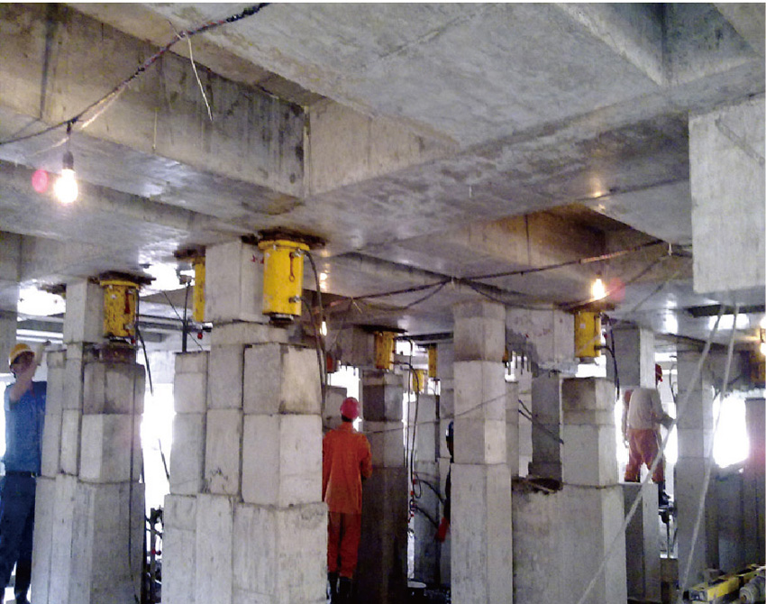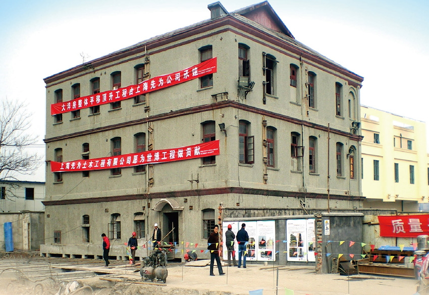 為了配合世博園區(qū)濱江大道與東方路的道路改建工程,該建筑分兩個階段平移。第一階段需向南平移36.1m;第二階段再向東平移3m,并整體頂升0.9m。 該工程于2010年5月完成。