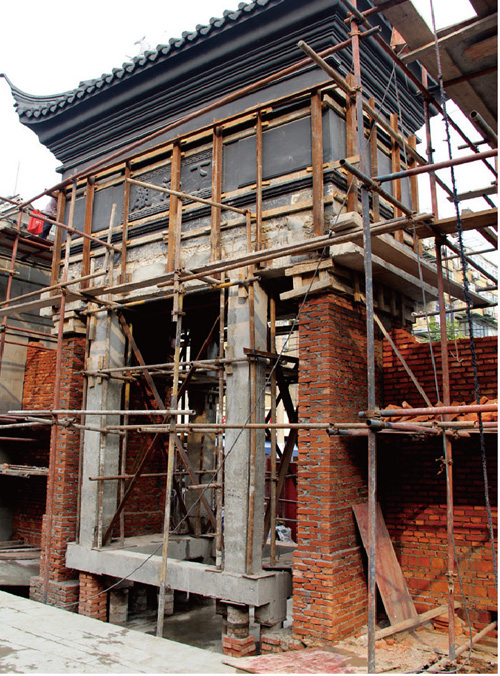 下海廟位于上海市虹口區(qū)昆明路73號(hào),占地726㎡ , 始建于清代乾隆年間,原山門年久失修,根據(jù)修繕計(jì)劃對(duì)原山門進(jìn)行整體平移0.37m,然后再整體頂升0.45m,最后加固連接完成。