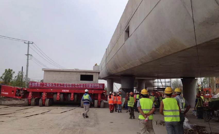 該工程為上海迪士尼建設(shè)工程中關(guān)鍵節(jié)點(diǎn),原設(shè)計(jì)的施工工序是橋梁現(xiàn)澆完成后再在橋下現(xiàn)澆配電房結(jié)構(gòu)。為了確保重點(diǎn)工程的重大節(jié)點(diǎn),決定采用事先在橋梁外側(cè)現(xiàn)澆完成配電房施工,待橋梁施工完畢后,將配電房平移至橋下的方法縮短工期。在建筑物頂部距離橋底部凈空只有10cm的情況下,我公司采用2輛SPMT液壓車模塊對配電房進(jìn)行平移,用了2個(gè)小時(shí)時(shí)間平移了85m, 就位偏差僅為5mm。