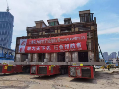 平移遷出階段,我司采用車載法(SPMT液壓車),將五棟建筑從原址平移至臨時址;遷回階段,采用車載法(SPMT液壓車)+頂推法相結(jié)合的方式,將五棟建筑從臨時址回遷至原址地下室。