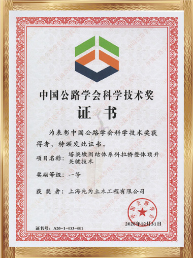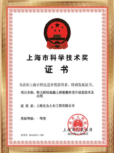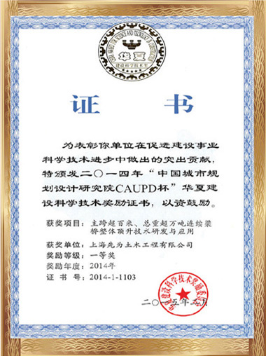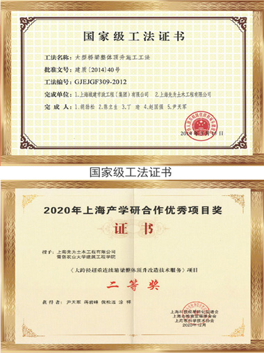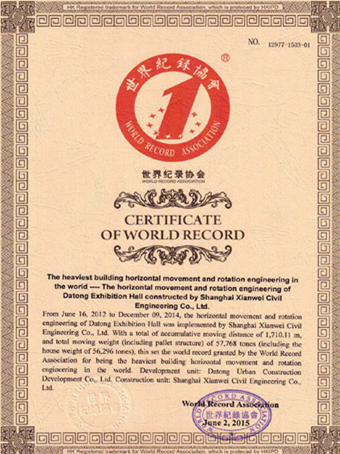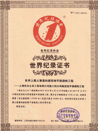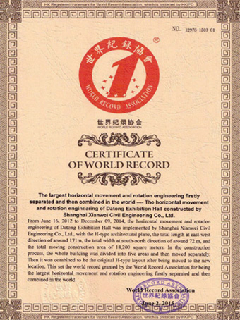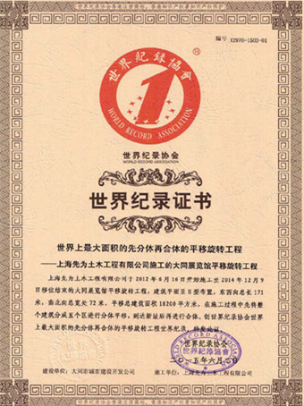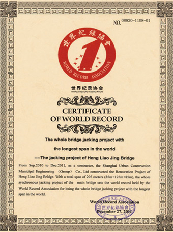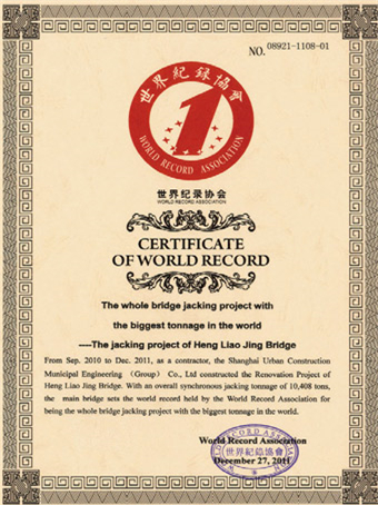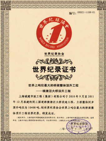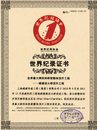 上海橫潦涇大橋頂升世界紀(jì)錄證書(shū)