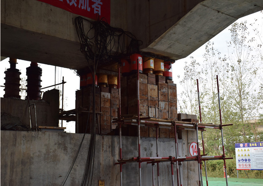 該橋位于寧杭高速公路,跨越南河航道,2003年建成通車(chē)。橋梁總長(zhǎng)659m, 其中主橋?yàn)閷?shí)土系桿拱橋,引橋?yàn)轭A(yù)應(yīng)力組合箱梁和現(xiàn)澆箱梁。橋梁為10X25m組合箱梁+130m鋼管混凝土系桿拱+4X25m組合箱梁+(2X20+18+14)m現(xiàn)澆箱梁+4X25m組合箱梁,橫向雙幅布置,單幅寬16.75m, 主橋最大跨徑為130m, 引橋共22跨。由于航道改造需要,需對(duì)全長(zhǎng)659m的南河特大橋整體頂升2.16m。頂升后北側(cè)引橋增加4跨,南側(cè)引橋增加6跨。改造總長(zhǎng)度1530m, 其中老橋頂升長(zhǎng)度659m, 新建橋跨250m,道路接坡721m。該橋比我們已完成的橫潦涇大橋整體頂升的最大跨徑還要大5m, 我司于2018年12月完成了該橋左半幅的整體頂升;于2019年6月完成了該橋右半幅的整體頂升。