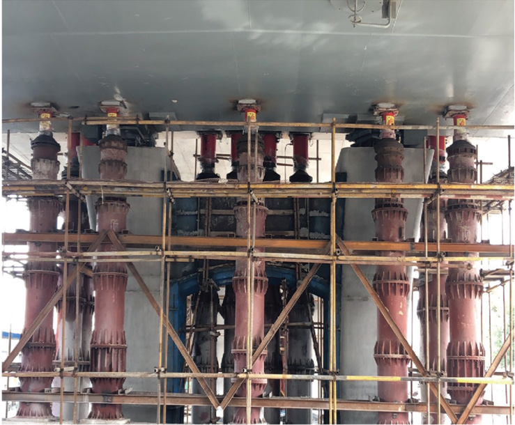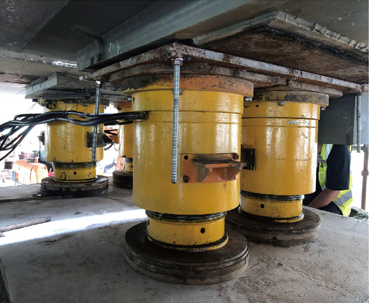 本次頂升段橋梁長約221m(跨徑30+30+53.4+53.4+ 27+ 27),寬25~32.5m,調(diào)坡頂升面積約6519㎡, 頂升高度為0.013~4.695m。