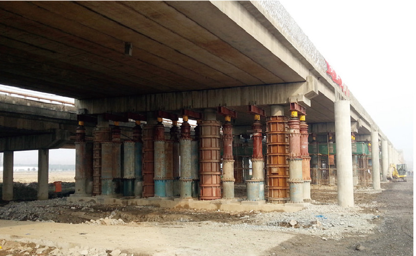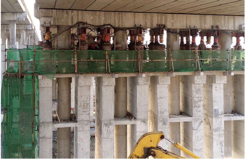 滬杭高速公路大蒸港橋,全長1570m, 分左右幅,單幅橋橋面寬度為15.75m,分離式雙幅橋斷面,雙向六車道規(guī)模。最大頂升高度3.312m,整體調(diào)坡頂升1.512~3.312m,左右幅共調(diào)坡頂升34聯(lián),調(diào)坡段為簡支板梁橋,單幅調(diào)坡頂升總長364m,該頂升工程的難度在于整體頂升高度較高以及原有立柱較高。