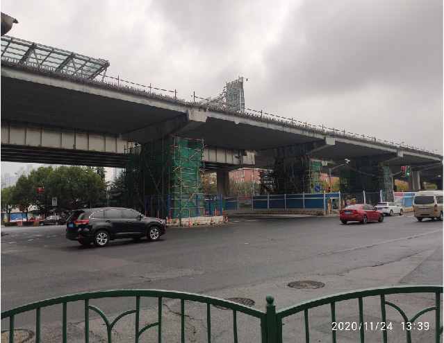 第二階段的頂升段為濟(jì)陽路高架楊思路耀體路跨線橋東半幅的6跨7墩,總長約115m。各墩頂升高度從0.196~7.637m不等,于2020年5月頂升到位;