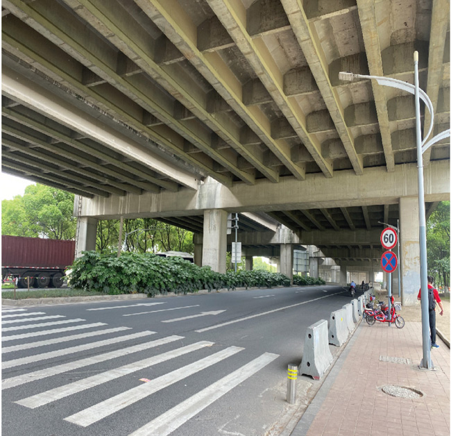 本次頂升段位于G1501高速公路與蘇申內(nèi)港線西段航道(吳淞江青浦段)交匯處,涉及6跨橋梁。橋梁上部結(jié)構(gòu)為預(yù)應(yīng)力簡支T形梁結(jié)構(gòu),呈左右兩幅結(jié)構(gòu)分離,蓋梁連續(xù),橋面呈變截面變化。橋面標(biāo)高調(diào)整高度為0~0.607m。