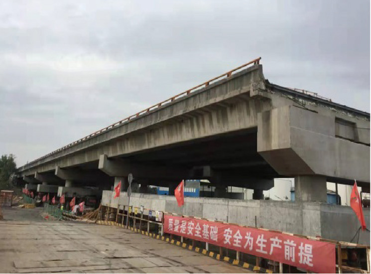 該橋位于寧啟高速公路南通境內(nèi),跨越九圩港。路拱橫坡為2%, 橋梁跨徑布置為5 x 25m+(36+60+36)m+ 7 x 25m, 橋梁全長439.4m, 橋面寬度28m。