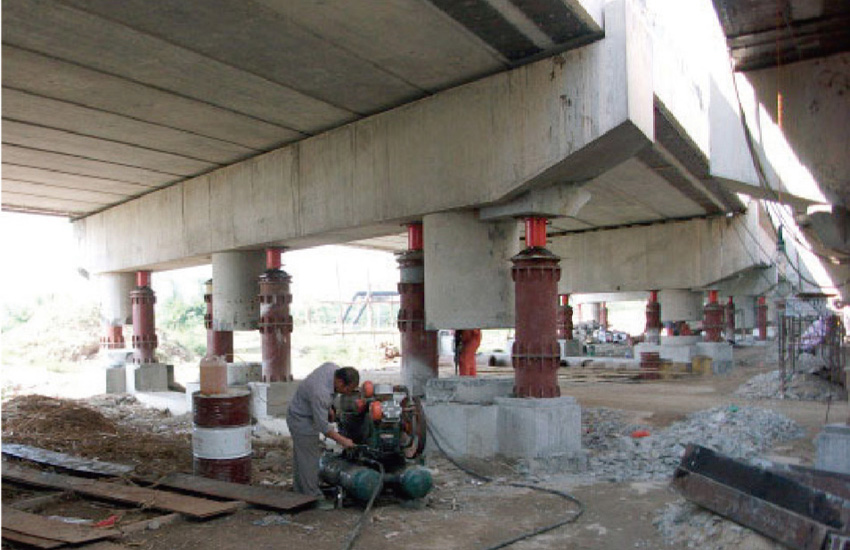 前鋒涌大橋全長(zhǎng)293.6m。橋跨為5X20m+3X30m+5x20m,上部結(jié)構(gòu)為空心板簡(jiǎn)支梁和砼連續(xù)箱梁,下部結(jié)構(gòu)為柱式墩、座板臺(tái)。頂升總面積6525㎡, 頂升總重量15000t, 頂升高度為0.45~1.5m, 在調(diào)坡頂升前對(duì)檢測(cè)出的病害部位做了碳纖維或粘鋼加固,此長(zhǎng)度調(diào)坡頂升工程當(dāng)時(shí)在國(guó)內(nèi)同類工程中尚屬首例。