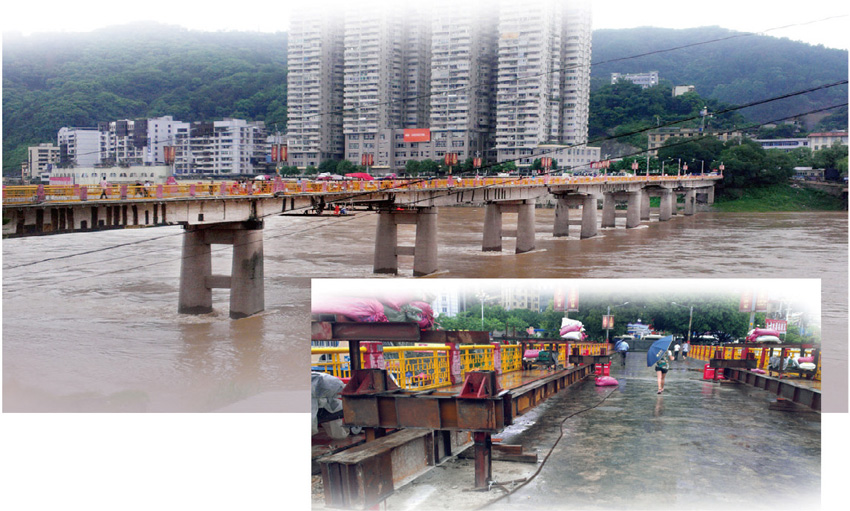 該工程首次采用在橋面在掛孔上方設(shè)置吊裝結(jié)構(gòu),穿過掛孔的主梁底部形成"U"結(jié)構(gòu),利用在主梁橋面上設(shè)置頂升千斤頂頂升通長的鋼扁擔(dān)梁,帶動下面的U形機構(gòu)形成整體頂升,從而帶動掛孔整體吊裝頂升。