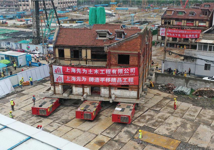 本次平移,五棟歷史建筑同時平移的壯舉,是上海及江浙滬地區(qū)歷史首次!我司采用先進的SPMT液壓平板車移位方法,將五棟建筑從原址位置經(jīng)多次轉(zhuǎn)向平移至中間址位置,五棟建筑平移距離均在190m以上,共計平移距離達1044m。