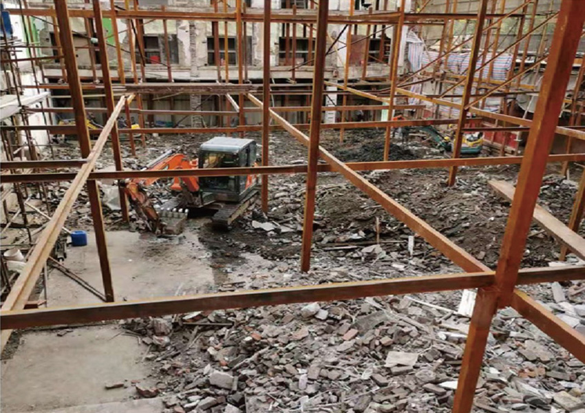 施工方案:保留三周外墻,內部全部拆除后新建砼框架梁板柱和條形基礎;外墻面臨時加固待內部框架完成后,再拆除外墻面進行二次結構施工,進行給排水與消防系統改造、室外總體環(huán)境整治等。