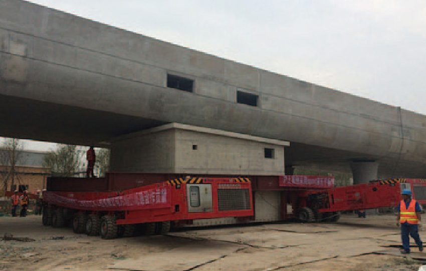 該工程為上海迪士尼建設(shè)工程中關(guān)鍵節(jié)點(diǎn),原設(shè)計(jì)的施工工序是橋梁現(xiàn)澆完成后再在橋下現(xiàn)澆配電房結(jié)構(gòu)。為了確保重點(diǎn)工程的重大節(jié)點(diǎn),決定采用事先在橋梁外側(cè)現(xiàn)澆完成配電房施工,待橋梁施工完畢后,將配電房平移至橋下的方法縮短工期。在建筑物頂部距離橋底部凈空只有10cm的情況下,我公司采用2輛SPMT液壓車模塊對配電房進(jìn)行平移,用了2個(gè)小時(shí)時(shí)間平移了85m, 就位偏差僅為5mm。