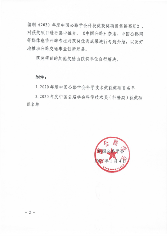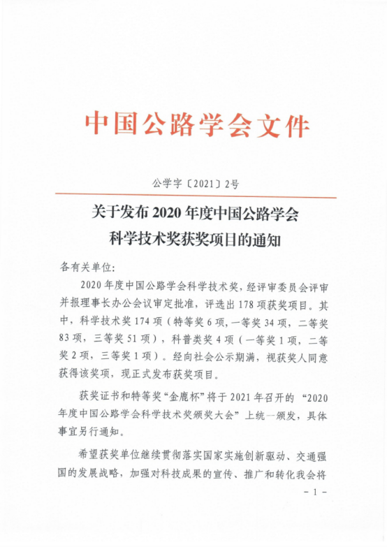 上海先為土木工程有限公司喜獲 “2020年度中國公路學(xué)會科學(xué)技術(shù)一等獎”!